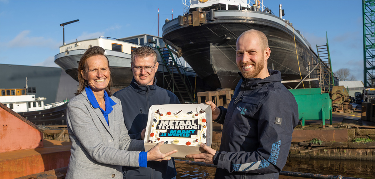 Geralda Brunsman, regiomanager district Oost Koninklijke Metaalunie, overhandigde een slagroomtaart aan René Kruft, manager operations en René Geertman eigenaar van Scheepswerf Geertman in Zwartsluis. De werf verdiende de taart vanwege de actieve deelname aan de sectorcampagne Metaaltechnologie maakt je wereld.