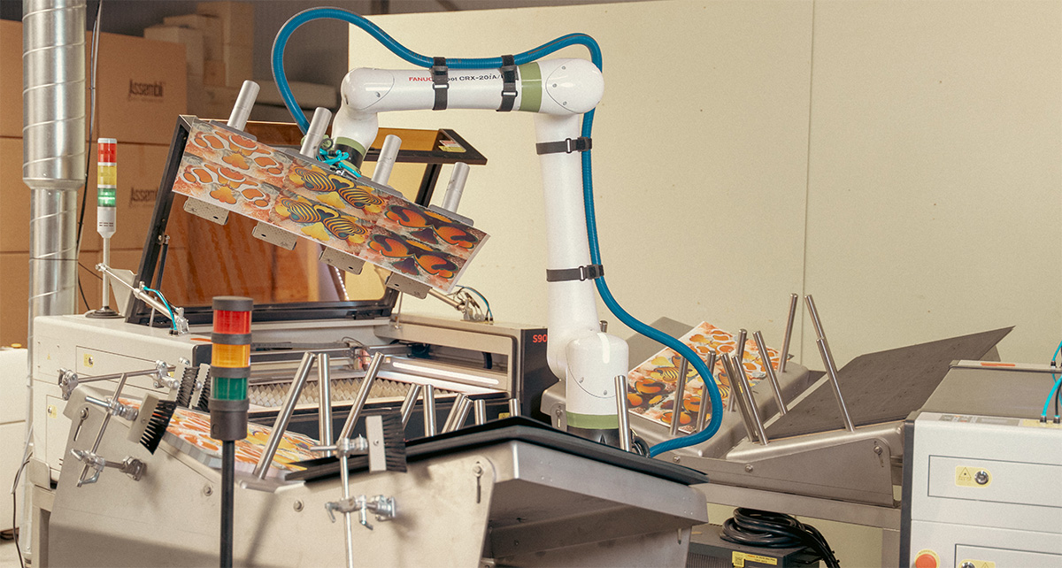De bouwpakketjes van Assembli worden met behulp van lasers uit papier gesneden. Tot voor kort werden de lasermachines handmatig beladen en ontladen, een arbeidsintensief proces. Afhankelijk van het type product duurt het lasersnijden één of meerdere minuten. Als de operator in de tussentijd andere werkzaamheden verricht, staan machines soms stil. En dat is kostbare tijd—zeker nu de verkoop toeneemt.