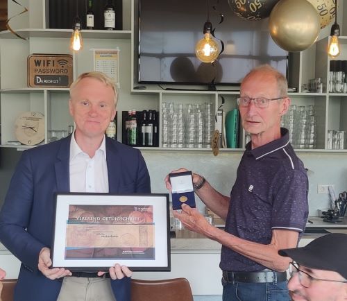Een welverdiend pensioen werd ingeluid met mooie cadeaus waaronder een schaalmodel van de oude T3 bus van Jan en vanuit Koninklijke Metaalunie is namens de Nederlandsche Maatschappij voor Nijverheid en Handel aan Jan Hiemstra een vererend getuigschrift én een legpenning goud met briljant uitgereikt wegens 50 jaar inzet en bijdrage aan de welvaart van Nederland. Dit is een bijzonder bewijs van waardering van het hele Nederlandse bedrijfsleven voor hen die zich langdurig hebben ingezet voor hun bedrijf en zo hun steentje aan de welvaart van Nederland hebben bijgedragen. Wij wensen Jan Hiemstra nog vele goede jaren toe in goede gezondheid!