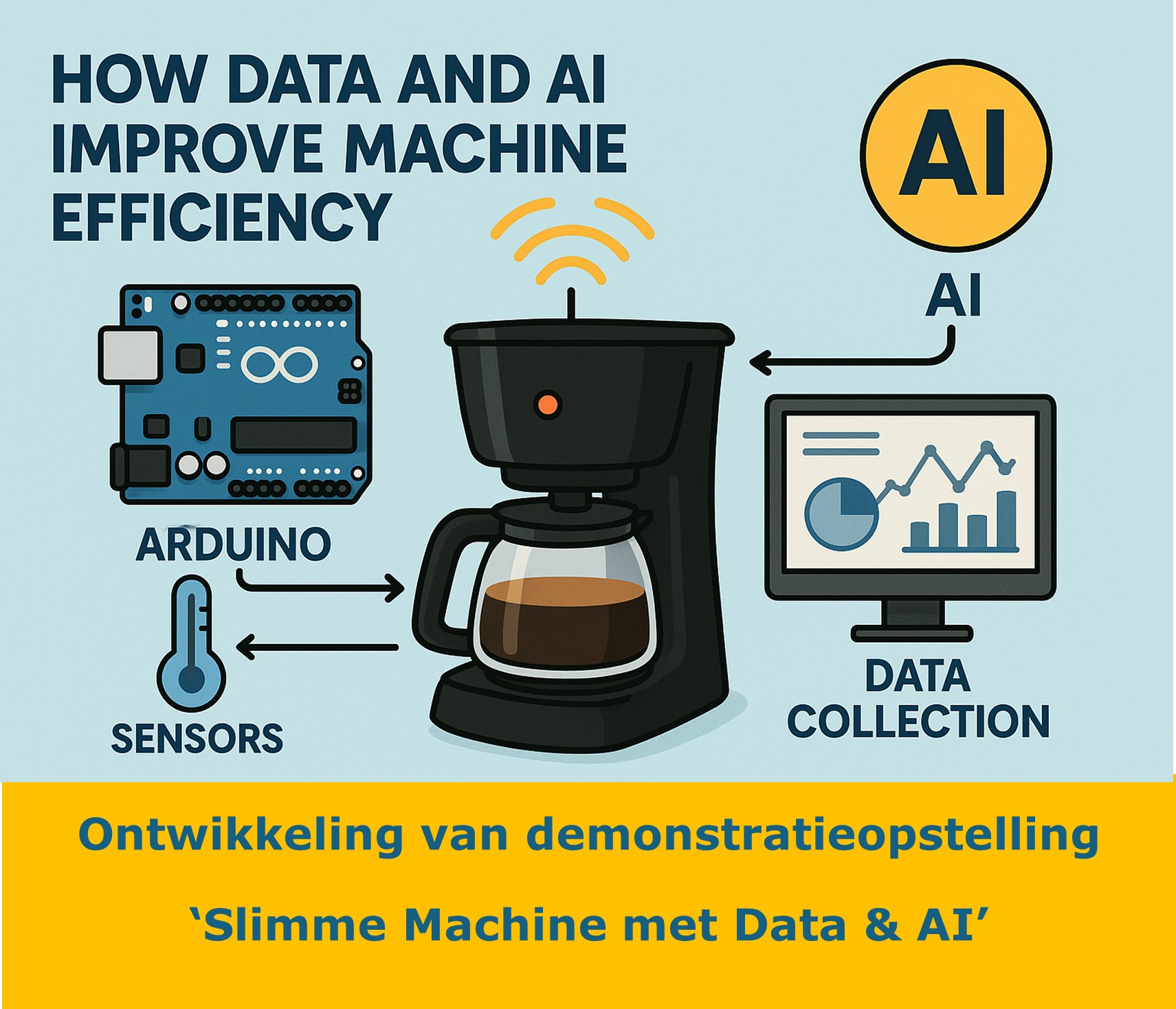 Wij zoeken een creatieve en technisch onderlegde partner voor het ontwikkelen van een demonstratieopstelling die op aansprekende wijze laat zien hoe een eenvoudige machine – zoals een koffiezetapparaat – slimmer, efficiënter en voorspelbaarder kan worden met behulp van data, sensoren, IoT-technologie (zoals Arduino of Raspberry Pi) en AI-toepassingen.