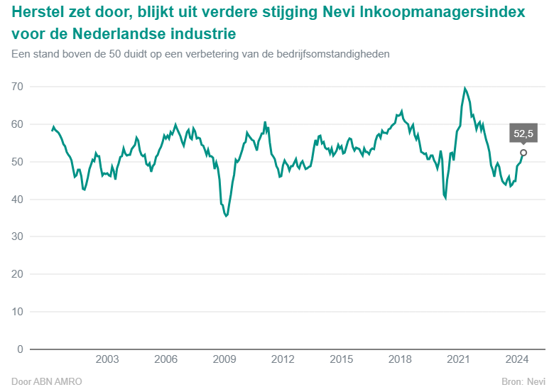 Het herstel van de Nederlandse industrie zet door. Zowel de productie als het aantal nieuwe orders stijgt sterk, zo blijkt uit de Nevi Inkoopmanagersindex, die verbeterde van 51.3 naar 52.5 over mei. Wanneer de index boven de 50 ligt, duidt dat op een toename van de industriële activiteit. De deelindicator voor de productie maakte een flinke sprong, van 52.8 naar 55.1, en duidt daarmee inmiddels op een sterke stijging van de productie. Ook de deelindicator voor de nieuwe orders verbeterde, van 53.7 naar 55.3.