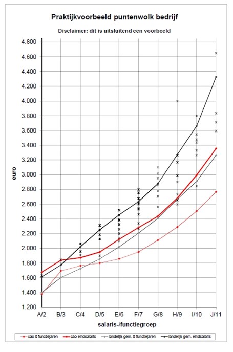 Koninklijke Metaalunie heeft hiervoor een instrument ontwikkeld. De feitelijke beloningen worden door middel van een formulier geïnventariseerd. In een totaaloverzicht ontvangt van ons per medewerker een vergelijking van de feitelijke beloning met CAO- en marktgegevens. Tevens krijgt u een zogeheten puntenwolkdiagram waarin de onderlinge beloningsverhoudingen in een oogopslag zichtbaar zijn gemaakt. Verder kunt u zien hoe uw onderneming scoort in vergelijking met het landelijk gemiddelde en de regio waarin uw bedrijf is gevestigd. De betekenis van de resultaten zullen door een adviseur van Metaalunie met u worden besproken.