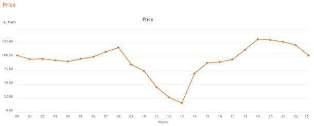 Hieronder zijn als voorbeeld de prijzen te zien van de EPEX-spotmarkt voor 22 april 2023.