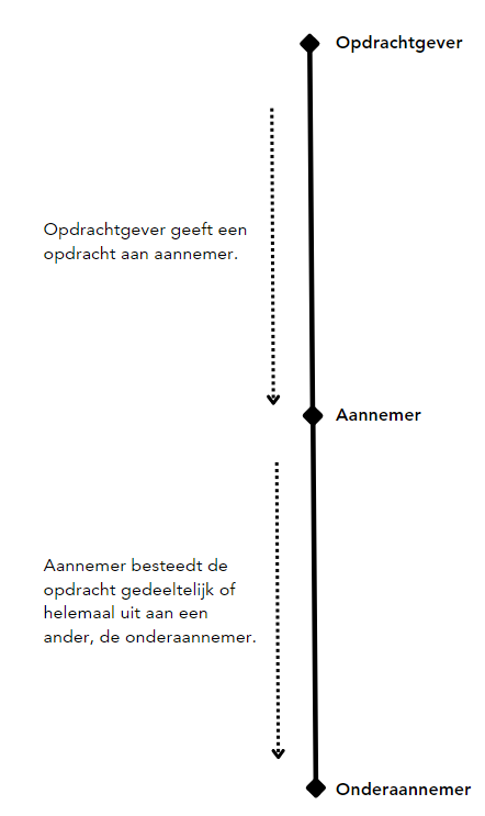 Tot slot heb je de onderaannemer. Dit is de partij aan wie de aannemer een deel van het werk uitbesteedt. Het kan ook zo zijn dat de aannemer de hele opdracht aan een onderaannemer uitbesteedt of delen van de opdracht aan meerdere onderaannemers. De onderaannemer kan op zijn beurt ook weer (een deel van) het werk uitbesteden aan een ander.