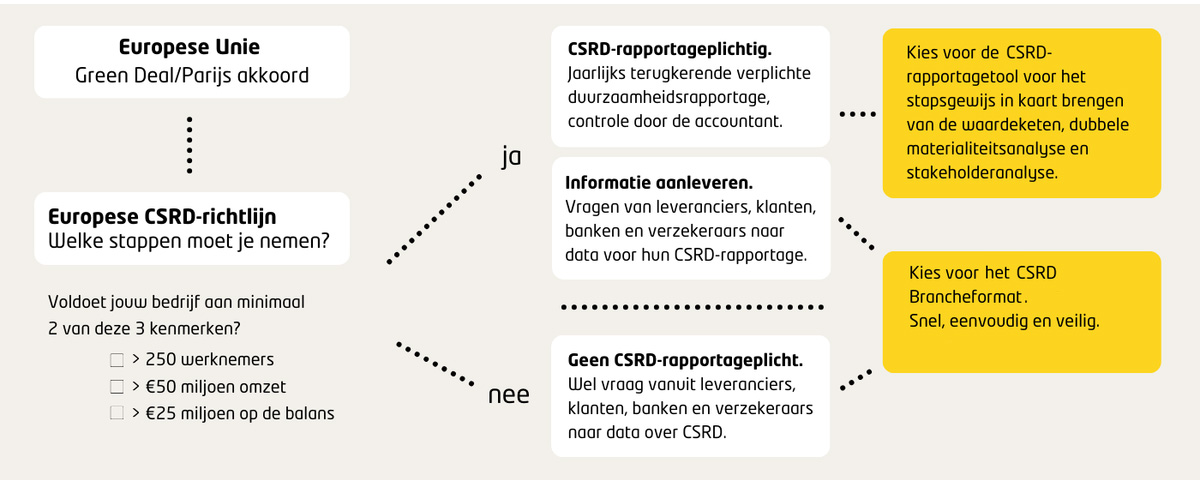 Of jouw bedrijf nu wel of niet verplicht is om te rapporteren, alle bedrijven kunnen vragen krijgen om informatie over CSRD aan te leveren. Daarbij wordt gevraagd naar jullie informatie of cijfers over de milieueffecten in de keten. Die vragen komen bijvoorbeeld van jouw klant, een verzekeringsmaatschappij of een bank.